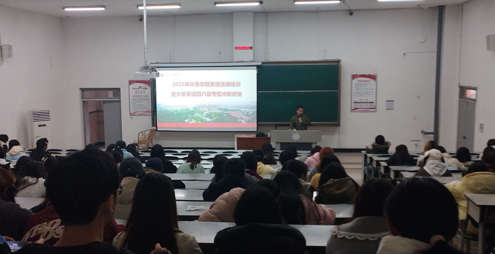 11月28日下午,外国语学院在荟文楼105教室成功举办2025-2026-2学期英语专业选课培训暨大学英语四六级考前冲刺讲座。讲座由学院科教科姬红生副科长主持,英语专业教研室主任黄睿、副主任邓甲文主讲,英语专业2023级、2024级、2025级全体同学参加。