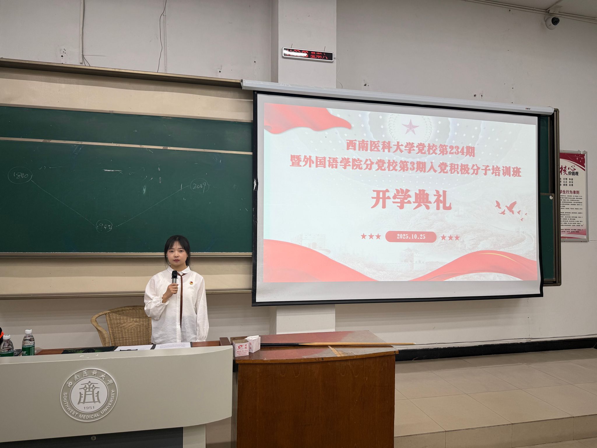 20251025日上午,西南医科大学党校第234期(外国语学院分党校第3期)入党积极分子培训班开学典礼在城北校区荟文楼104室隆重举行。外国语学院分党校全体校务委员、第234期培训班全体学员等出席典礼。典礼由外国语学院党委副书记、纪委书记、分党校副校长邓盛木主持。