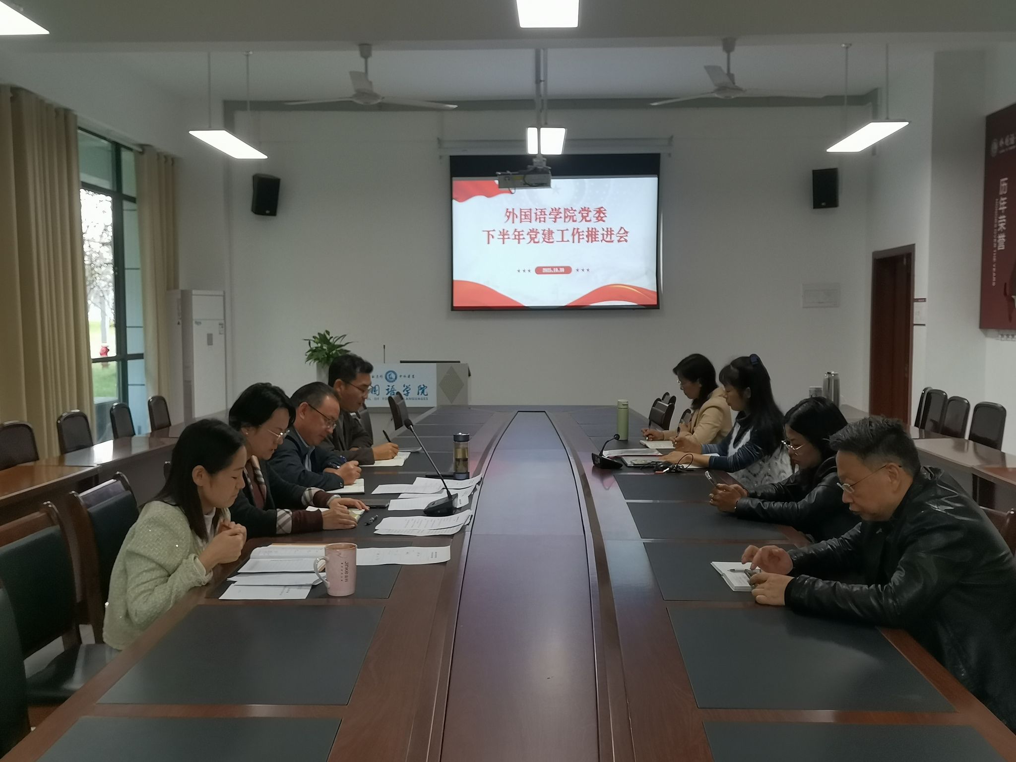 10月30日下午,外国语学院党委在文渊楼134会议室组织召开下半年党建工作推进会。会议由学院党委书记周晓昀主持,全体处科级干部(含国际教育学院处级领导)、专职组织员、党支部书记参加会议。