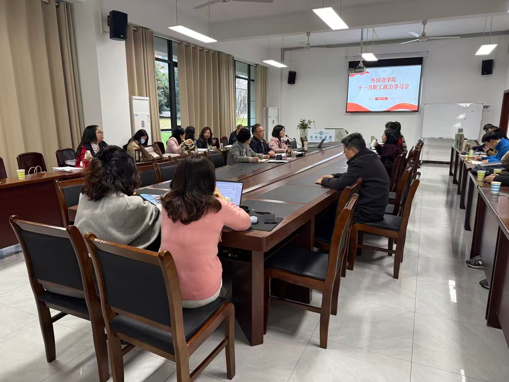 为持续深化理论武装,筑牢思想根基,11月13日下午,外国语学院在城北校区文渊楼134会议室组织召开11月教职工政治理论学习会。会议由党委书记周晓昀主持,学院全体教职工参加。