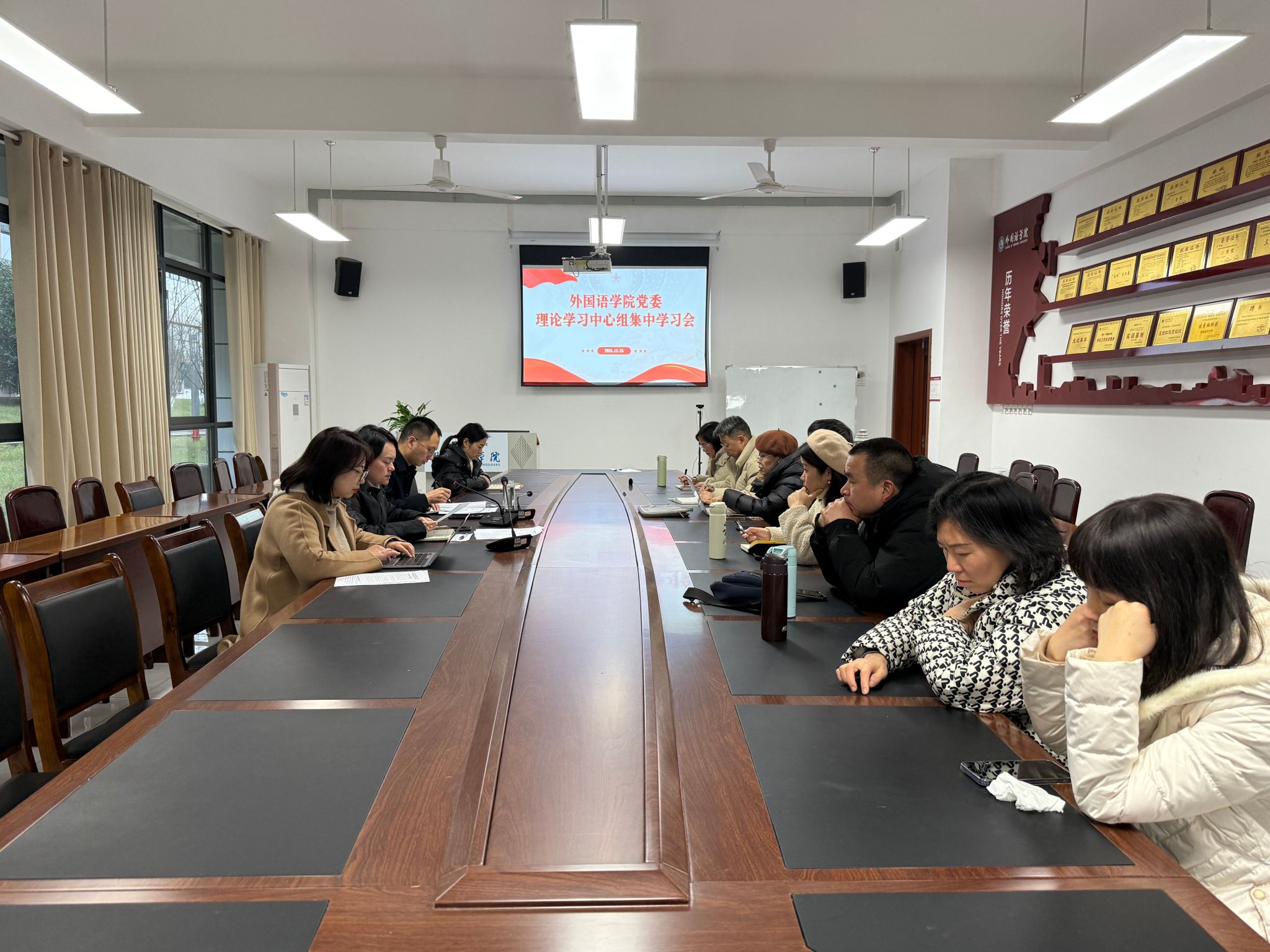 12月25日下午,外国语学院党委在文渊楼134会议室召开理论学习中心组(扩大)集中学习会。学院党委书记蔡鹏飞主持会议,学院党委委员、专职组织员、党支部书记、行政科室负责人、教研室(实验室)主任及副主任参加会议。