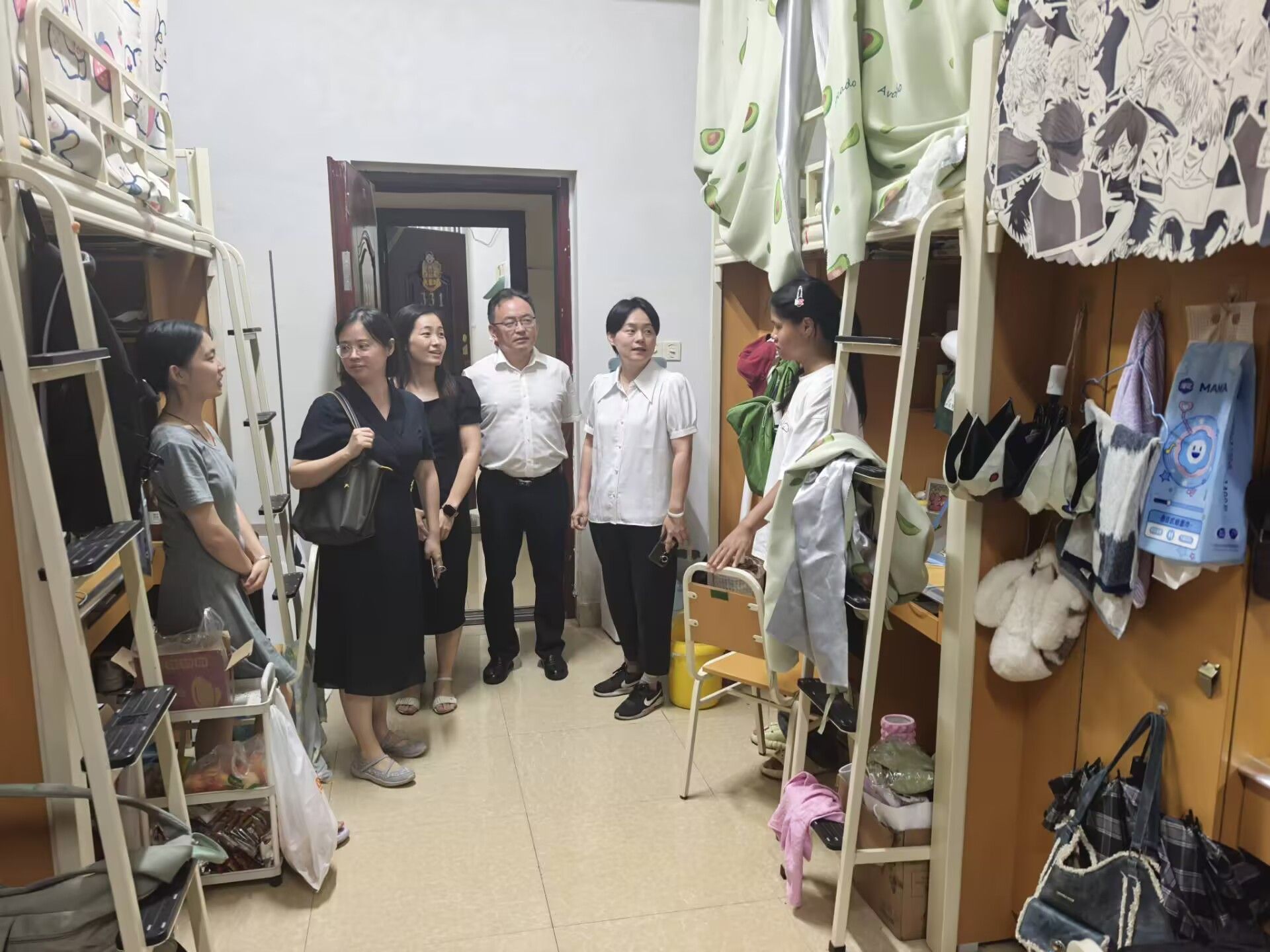 为了解学生新学期的学习和生活状况,进一步强化教育引导、筑牢成长根基,8月31日,外国语学院开展新学期寝室走访活动。学院党委书记周晓昀、主持工作副院长王琳、党委副书记邓盛木及科教科、学生科负责人一起深入学生寝室,为同学们送去新学期第一声问候与第一份温暖。