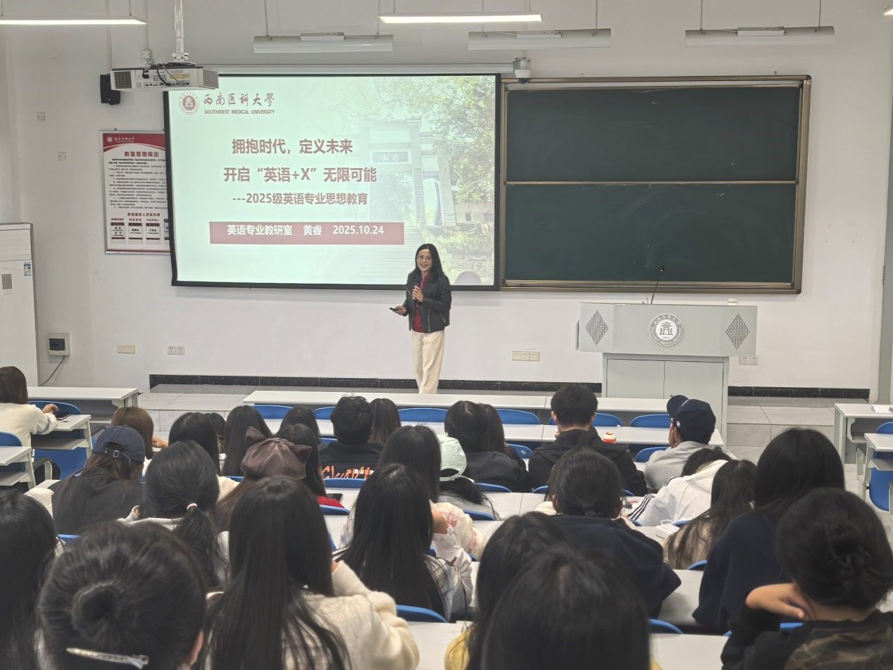 为帮助2025级新生加深对学业与职业的认识,外国语学院于10月24日下午在学海楼402室举办“拥抱时代,定义未来——‘英语+X’的无限可能”专业思想教育讲座。讲座由学生科科长赖秀娟担任主持,英语专业教研室主任黄睿担任主讲,2025年英语专业全体新生参加。
