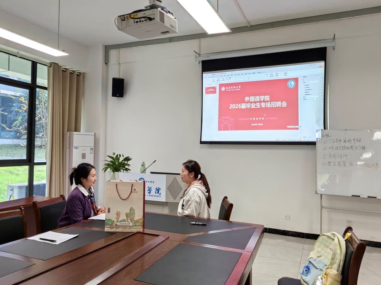 经外国语学院组织,中创新航科技集团股份有限公司于2025年11月4日中午在文渊楼134教室举办了专场招聘面试。此次面试由中创新航科技集团股份有限公司招聘主管宋敏主持,包括英语专业在内的全校各专业30余名学生提交了简历并参加面试。
