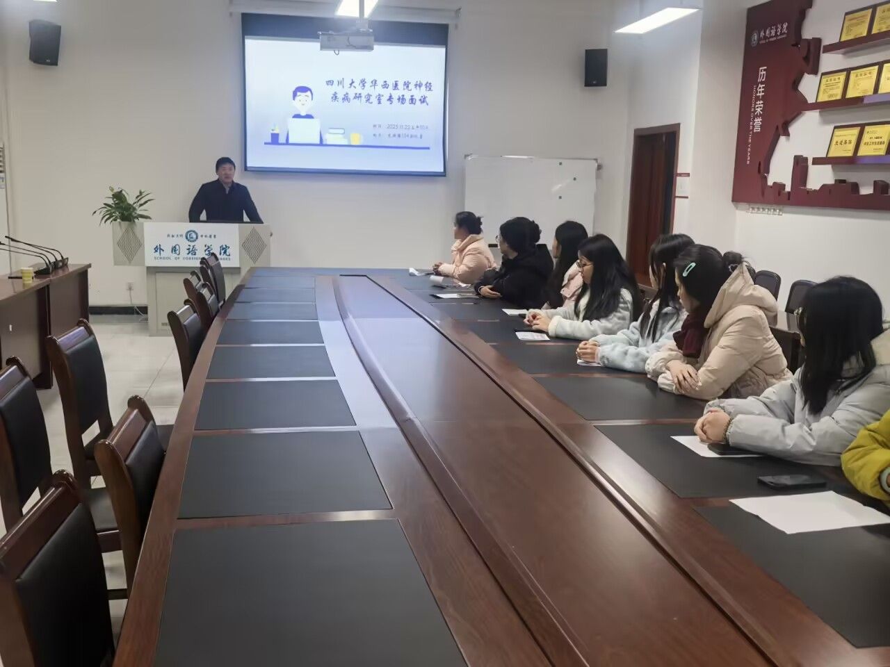 2025年11月22日,四川大学华西神经疾病研究室王廷华教授一行应外国语学院邀请来校,在文渊楼134会议室举行专场面试。经过前期报名和现场一对一面试,12名2026届毕业生凭借扎实的专业功底、出色的综合素质和科研潜力脱颖而出,顺利通过面试,进入下一轮考核。