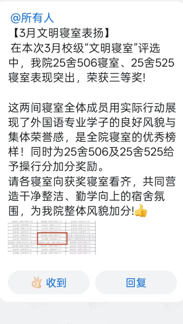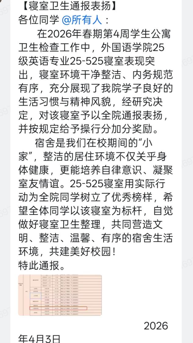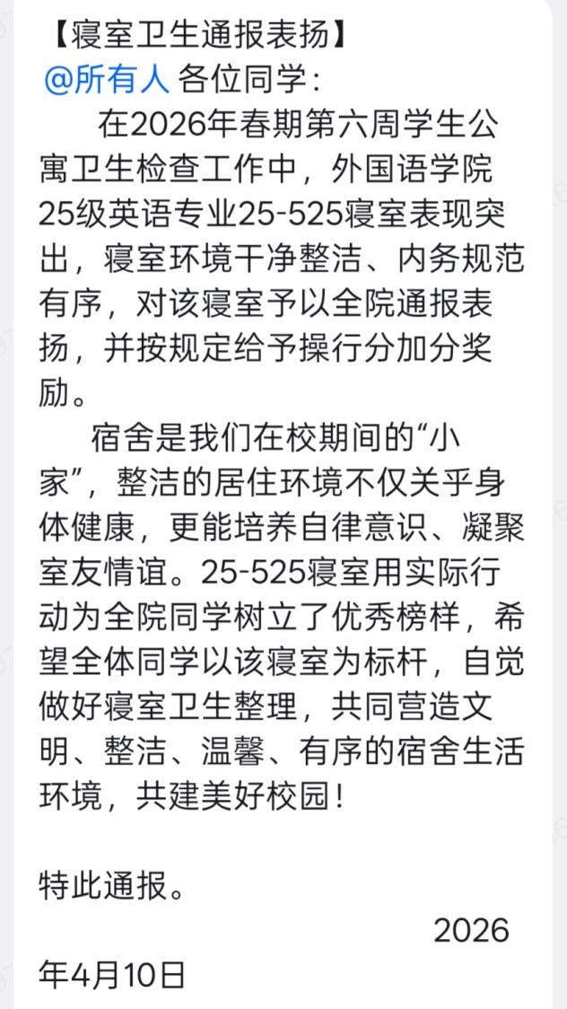 此次荣誉的获得,为全院学生宿舍树立了良好榜样。学院希望获奖寝室珍惜荣誉、再接再厉,持续保持优良作风,发挥示范引领作用;同时号召全院学生以获奖寝室为榜样,自觉规范自身行为,共同打造整洁、文明、有序的宿舍环境,以良好的宿舍氛围助力自身成长成才,推动学院校园文明建设再上新台阶。